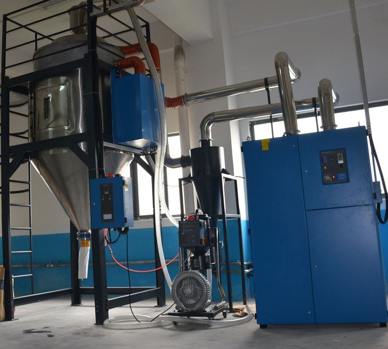 中央供料系統(tǒng)采用高壓風(fēng)機(jī)真空輸送方式,通過(guò)集中的管路系統(tǒng)將塑料原料從儲(chǔ)料罐輸送到中央干燥系統(tǒng),然后將干燥后的原料輸送到每臺(tái)注塑機(jī)中。
